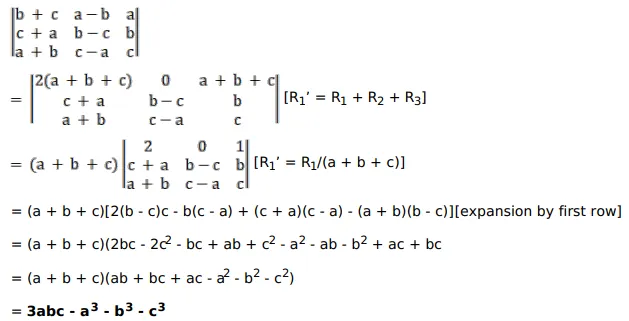 $\left|\begin{array}{lll}b+c & a-b & a \\ c+a & b-c & b \\ a+b & c-a & c\end{array}\right|=3 a b c-a^{3}-b^{3}-c^{3}$