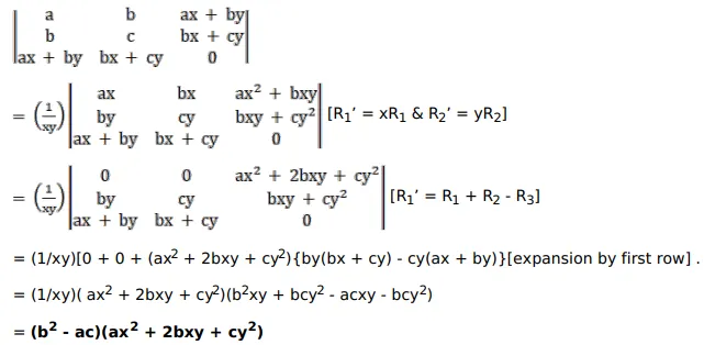 $\left|\begin{array}{ccc}a & b & a x+b y \\ b & c & b x+c y \\ a x+b y & b x+c y & 0\end{array}\right|=\left(b^{2}-a c\right)\left(a x^{2}+3 b x y+c y^{2}\right)$