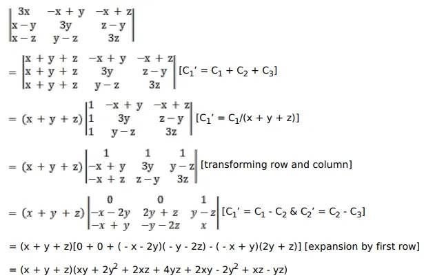 $\left|\begin{array}{ccc}3 x & -x+y & -x+z \\ x-y & 3 y & z-y \\ x-z & y-z & 3 z\end{array}\right|=3(x+y+z)(x y+y z+z x)$