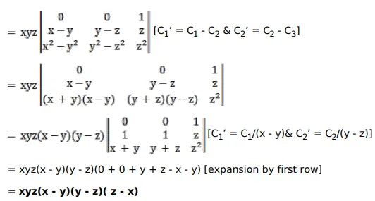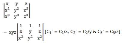 $\left|\begin{array}{ccc}x & y & z \\ x^{2} & y^{2} & z^{2} \\ x^{3} & y^{3} & z^{3}\end{array}\right|=x y z(x-y)(y-z)(z-x)$
