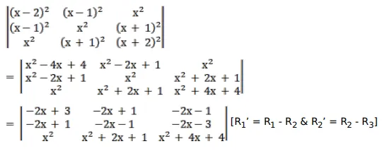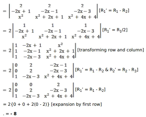 $\left|\begin{array}{ccc}(x-2)^{2} & (x-1)^{2} & x^{2} \\ (x-1)^{2} & x^{2} & (x+1)^{2} \\ x^{2} & (x+1)^{2} & (x+2)^{2}\end{array}\right|=-8$