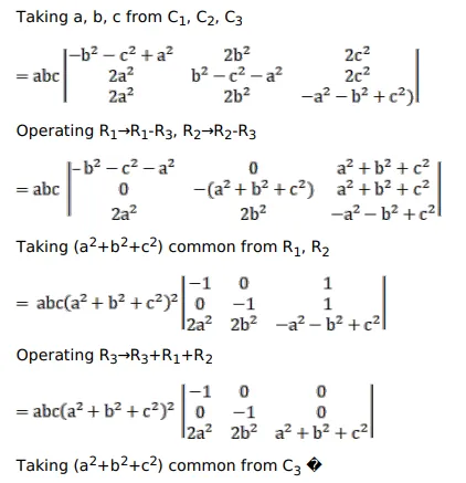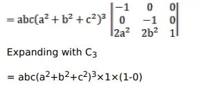 $\left|\begin{array}{ccc}-a\left(b^{2}+c^{2}-a^{2}\right) & 2 b^{3} & 2 c^{3} \\ 2 a^{3} & -b\left(c^{2}+a^{2}-b^{2}\right) & 2 c^{3} \\ 2 a^{3} & a b^{3} & -c\left(a^{2}+b^{2}+c^{2}\right)\end{array}\right|=(a b c)\left(a^{2}+b^{2}+c^{2}\right)^{3}$