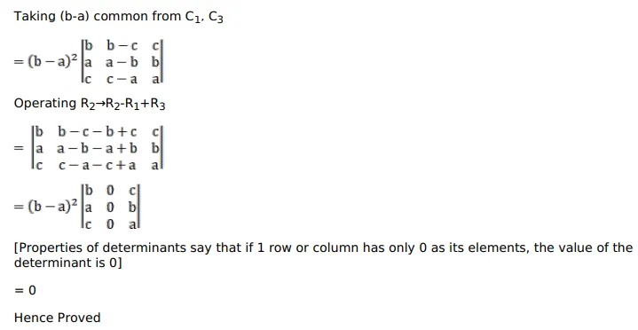 $=\left|\begin{array}{lll}b(b-a) & b-c & c(b-a) \\ a(b-a) & a-b & b(b-a) \\ c(b-a) & c-a & a(b-a)\end{array}\right|$