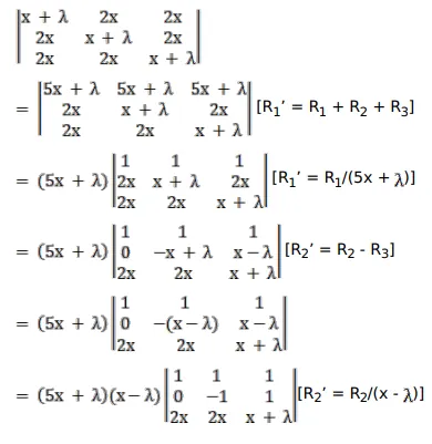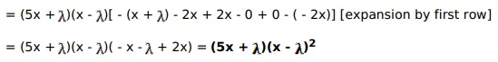 $\left|\begin{array}{ccc}x+\lambda & 2 x & 2 x \\ 2 x & x+\lambda & 2 x \\ 2 x & 2 x & x+\lambda\end{array}\right|=(5 x+\lambda)(\lambda-x)^{2}$
