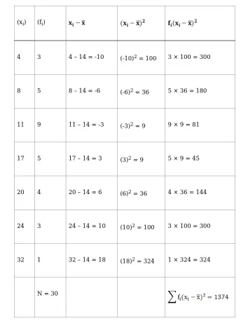 Variance, $\sigma^{2}=\frac{\sum \mathrm{f}_{\mathrm{i}}\left(\mathrm{x}_{\mathrm{i}}-\overline{\mathrm{x}}\right)^{2}}{\mathrm{~N}}$