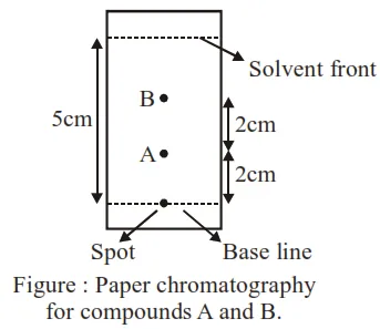 $\mathrm{R}_{\mathrm{f}}=\frac{\text { Distance travelled by compound }}{\text { Distance travelled by solvent }}$