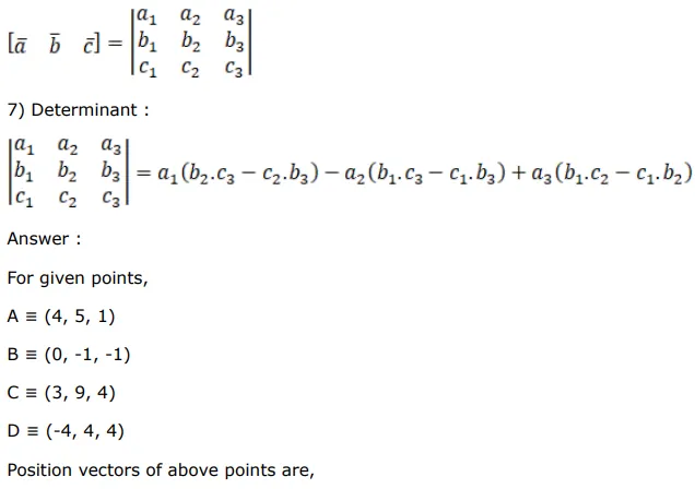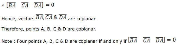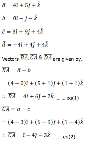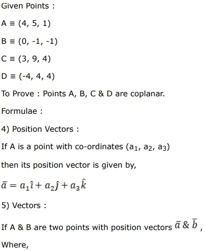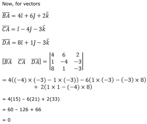 Using vector method, show that the points $A(4,5,1), B(0,-1,-1), C(3,9,4)$ and $D(-4,4,4)$ are coplanar.