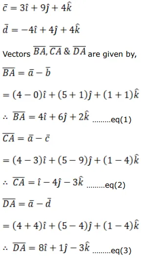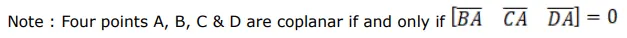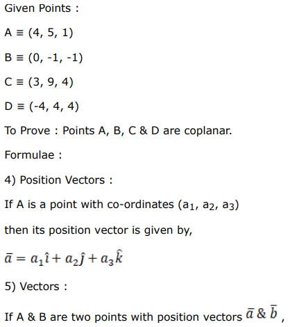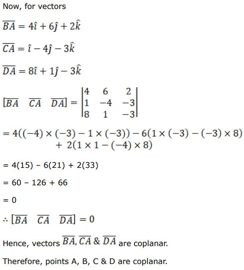 Using vector method, show that the points $A(4,5,1), B(0,-1,-1), C(3,9,4)$ and $D(-4,4,4)$ are coplanar.