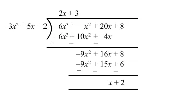 $\therefore-6 x^{3}+x^{2}+20 x+8=\left(-3 x^{2}+5 x+2\right)(2 x+3)+x+2$