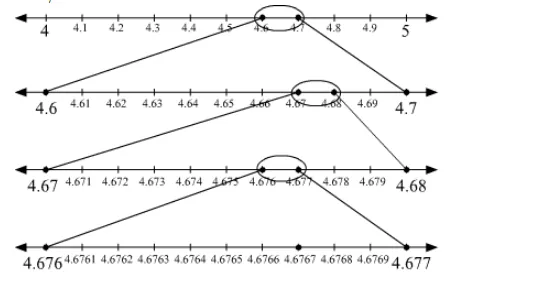 In order to locate the point 4.6767 on the number line, divide the gap between 4.6 and 4.7 into 10 equal parts.