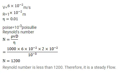 Water flows at a speed of $6 \mathrm{~cm} / \mathrm{s}$ through a tube of radius $1 \mathrm{~cm}$. Coefficient of viscosity of water at room temperature is $0.01$ poise. Calculating the Reynolds number. Is it a steady flow?