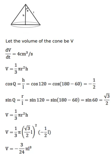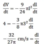Water is dripping through a tiny hole at the vertex in the bottom of a conical funnel at a uniform rate of 4 $\mathrm{cm}^{3} / \mathrm{s}$. When the slant height of the water is $3 \mathrm{~cm}$, find the rate of decrease of the slant height of the water, given that the vertical angle of the funnel is $120^{\circ}$.