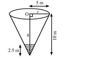 Water is running into an inverted cone at the rate of π cubic metres per minute. The height of the cone is 10 metres, and the radius of its base is 5 m. How fast the water level is rising when the water stands 7.5 m below the base.