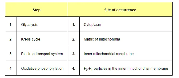 The major steps in aerobic respiration and the sites where they occur are listed in the given table.