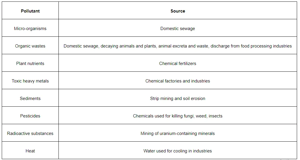 1. Pathogens: These water pollutants include bacteria and other organisms. They enter water from animal excreta and domestic sewage. Bacteria present in human excreta (for example, Escherichia coli and Streptococcus faecalis) cause gastrointestinal diseases.