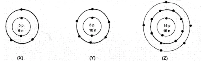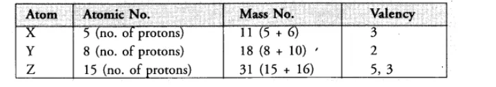 What information do you get from the following electronic distribution about the atomic number, mass number and valency of atoms $X, Y$ and $Z$ ? Give your answer in a tabular form.