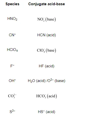 The conjugate acid-base for the given species is mentioned in the table below.