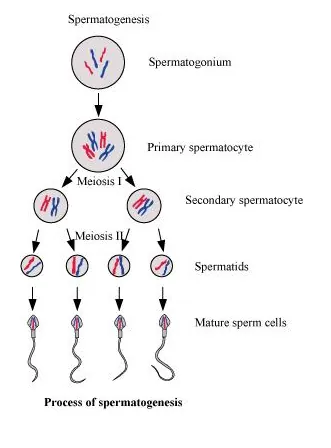 Spermatogenesis is the process of the production of sperms from the immature germ cells in males. It takes place in seminiferous tubules present inside the testes. During spermatogenesis, a diploid spermatogonium (male germ cell) increases its size to form a diploid primary spermatocyte. This diploid primary spermatocyte undergoes first meiotic division (meiosis I), which is a reductional division to form two equal haploid secondary spermatocytes. Each secondary spermatocyte then undergoes second meiotic division (meiosis II) to form two equal haploid spermatids. Hence, a diploid spermatogonium produces four haploid spermatids. These spermatids are transformed into spermatozoa (sperm) by the process called spermiogenesis.