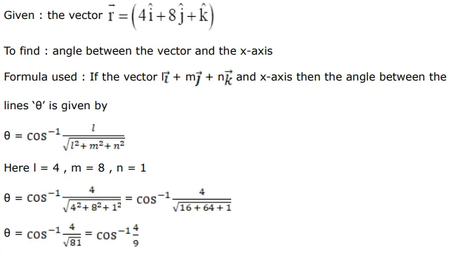 What is the angle between the vector $\overrightarrow{\mathrm{r}}=(4 \hat{\mathrm{i}}+8 \hat{\mathrm{j}}+\hat{\mathrm{k}})$ and the $x$-axis?