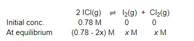 Now, we can write, $\frac{\left[\mathrm{I}_{2}\right]\left[\mathrm{Cl}_{2}\right]}{[\mathrm{ICl}]^{2}}=K_{\mathrm{C}}$