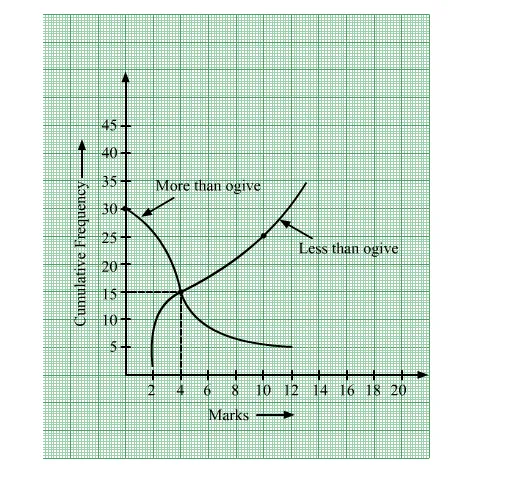 From the given figure, it can be seen that both the ogives intersect at the point (4, 15).