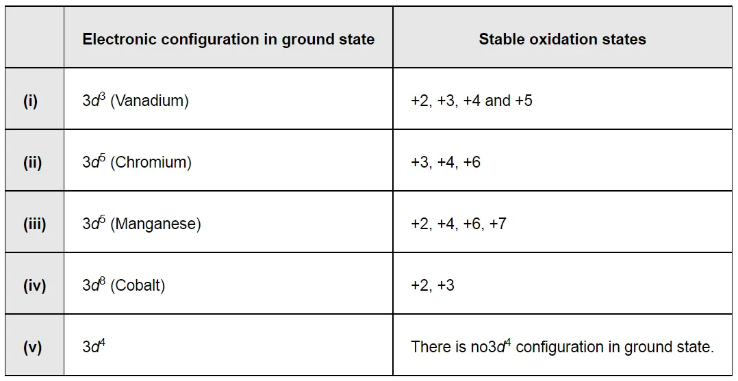 What may be the stable oxidation state of the transition element with the following d electron configurations in the ground state of their atoms : 3d3, 3d5, 3d8and 3d4?