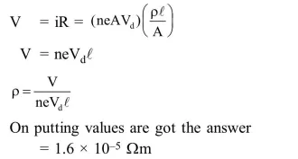 When $5 \mathrm{~V}$ potential difference is applied across a wire of length $0.1 \mathrm{~m}$, the drift speed of electrons is $2.5 \times 10^{-4} \mathrm{~ms}^{-1}$. If the electron density in the wire is $8 \times 10^{28} \mathrm{~m}^{-3}$, the resistivity of the material is close to :-