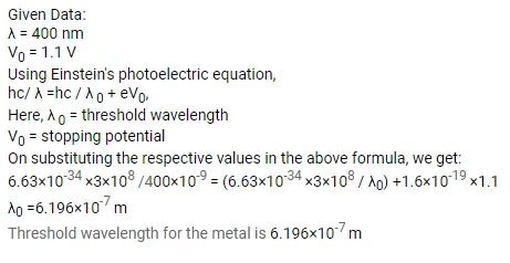 When a metal plate is exposed to a monochromatic beam of light of wavelength $400 \mathrm{~nm}$, a negative potential of $1.1 \mathrm{~V}$ is needed to stop the photo current. Find the threshold wavelength for the metal.
