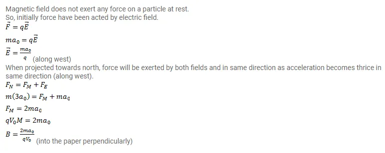 When a proton is released from rest in a room, its starts with an initial acceleration $a_{0}$ towards west. When it is projected towards north with a speed $v_{0}$, it moves with an initial acceleration $3 \mathrm{a}_{0}$ towards west. Find the electric field and the maximum possible magnetic field in the room.