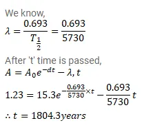 When charcoal is prepared from a living tree, it shows a disintegration rate of $15.3$ disintegration of ${ }^{14} \mathrm{C}$ per gram per minute. A sample from an ancient piece of charcoal shows ${ }^{14} \mathrm{C}$ activity to be $12.3$ disintegration per gram per minute. How old is this sample? Half-life of ${ }^{14} \mathrm{C}$ is $5730 \mathrm{y}$.