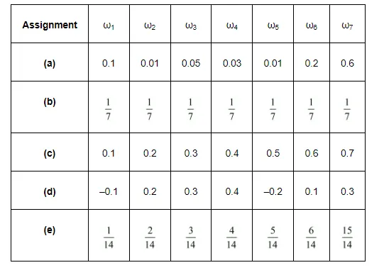 Which of the following can not be valid assignment of probabilities for outcomes of sample space $S=\left\{\omega_{1}, \omega_{2}, \omega_{3}, \omega_{4}, \omega_{5}, \omega_{6}, \omega_{7}\right\}$