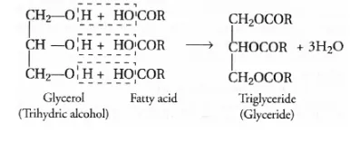 These fatty acids exist as triesters of glycerol which is a trihydric alcohol. The triesters are also called triglycerides or simply glycerides and are the