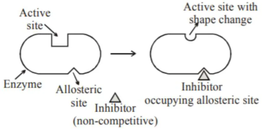 This binding of inhibitor at allosteric site changes the shape of the active site in such a way that substrate can not recognise it Such inhibitor is known as Non-competitive inhibitor.