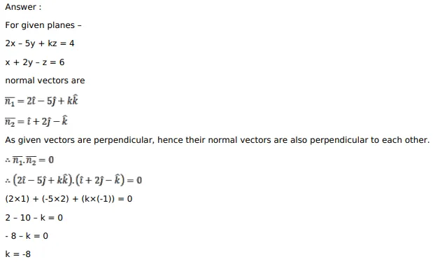 Write the value of $k$ for which the planes $2 x-5 y+k z=4$ and $x+2 y-z=6$ are perpendicular to each other.