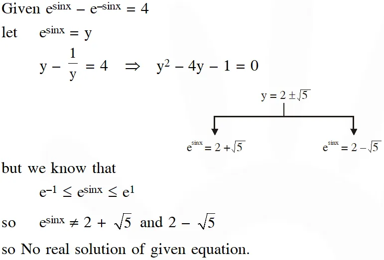 Q. The equation $\mathrm{e}^{\mathrm{sinx}}-\mathrm{e}^{-\mathrm{sinx}}-4=0$ has :