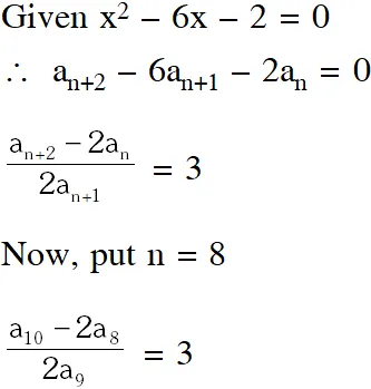 Q. Let and $\beta$ be the roots of equation $\mathrm{x}^{2}-6 \mathrm{x}-2=0 .$ If $\mathrm{a}_{\mathrm{n}}=\alpha^{\mathrm{n}}-\beta^{\mathrm{n}},$ for $\mathrm{n} \geq$ 1, then the value of $\frac{\mathrm{a}_{10}-2 \mathrm{a}_{8}}{2 \mathrm{a}_{9}}$ is equal to :