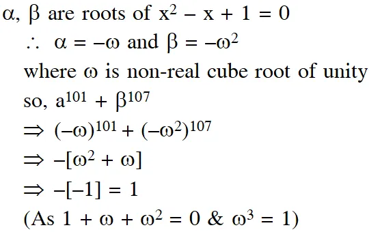 Q. If $\alpha, \beta \in \mathrm{C}$ are the distinct roots of the equation $\mathrm{x}^{2}-\mathrm{x}+1=0,$ then $\alpha^{101}+\beta^{107}$ is equal to-
