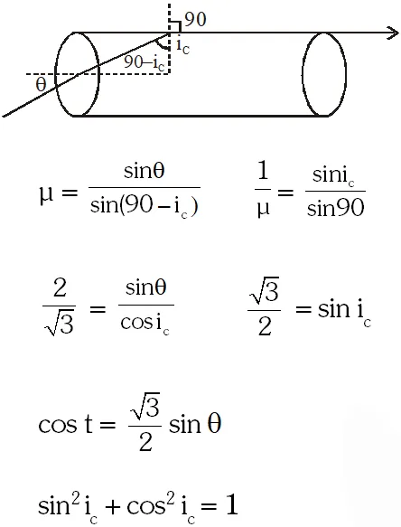 JEE Main Previous Year Question of Physics with Solutions are available here. Practicing JEE Main Previous Year Papers Questions of Physics will help all the JEE aspirants in realizing the question pattern as well as help in analyzing their weak & strong areas. Get detailed Class 11th &12th Physics Notes to prepare for Boards as well as competitive exams like IIT JEE, NEET etc. eSaral helps the students in clearing and understanding each topic in a better way. eSaral is providing complete chapter-wise notes of Class 11th and 12th both for all subjects. Besides this, eSaral also offers NCERT Solutions, Previous year questions for JEE Main and Advance, Practice questions, Test Series for JEE Main, JEE Advanced and NEET, Important questions of Physics, Chemistry, Math, and Biology and many more. Download eSaral app for free study material and video tutorials. Simulator Previous Years AIEEE/JEE Mains Questions Q. A transparent solid cyclindrical rod has a refractive index of . It is surrounded by air. A light ray is incident at the mid-point of one end of the rod as shown in the figure. The incident angle $\theta$ for which the light ray grazes along the wall of the rod is :-