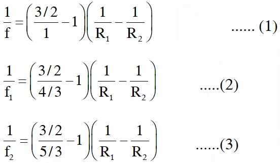 Q. A thin convex lens made from crown glass $\left(\mu=\frac{3}{2}\right)$ has focal length ƒ. When it is measured in two different liquids having refractive indices $\frac{4}{3}$ and $\frac{5}{3}$ and , it has the focal length $f_{1}$ and $f_{2}$ respectively. The correct relation between the focal lengths is : (1) $f_{2}>f$ and $f_{1}$ becomes negative (2) $f_{1}$ and $f_{2}$ both become negative (3) $f_{1}=f_{2} (4) $f_{1}>f$ and $f_{2}$ become negative [JEE-Mains- 2014]