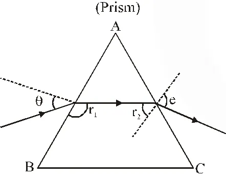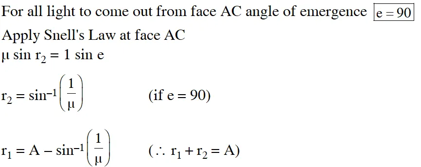 Apply Snell's law at face AB $1 \sin \theta=\mu \sin \left(r_{1}\right)$ $\theta=\sin ^{-1}\left(\mu \sin \left(A-\sin ^{-1}\left(\frac{1}{\mu}\right)\right)\right.$ for all light transmitted through $\mathrm{AC}, \mathrm{e}<90^{\circ}$ $\Rightarrow \theta>\sin ^{-1}\left(\mu \sin \left(A-\sin ^{-1}\left(\frac{1}{\mu}\right)\right)\right.$ Q. An observer looks at a distant tree of height 10 m with a telescope of magnifying power of 20. To the observer the tree appears : (1) 20 times nearer (2) 10 times taller (3) 10 times nearer (4) 20 times taller [JEE-Mains- 2016]