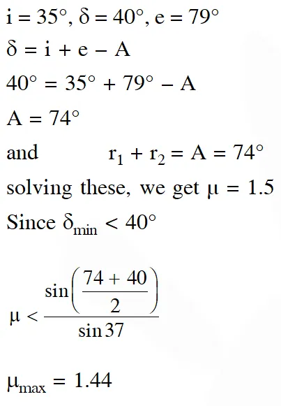 Q. In an experiment for determination of refractive index of glass of a prism by i – , plot, it was found that a ray incident at angle $35^{\circ}$, suffers a deviation of $40^{\circ}$ and that it emerges at angle $79^{\circ}$. In that case which of the following is closest to the maximum possible value of the refractive index? (1) 1.8 (2) 1.5 (3) 1.6 (4) 1.7 [JEE-Mains- 2016]