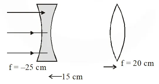 As parallel beam incident on diverging lens if forms virtual image at $\mathbf{V}_{1}$ = –25 cm from the diverging lense which works as a object for the converging lense (f = 20 cm)