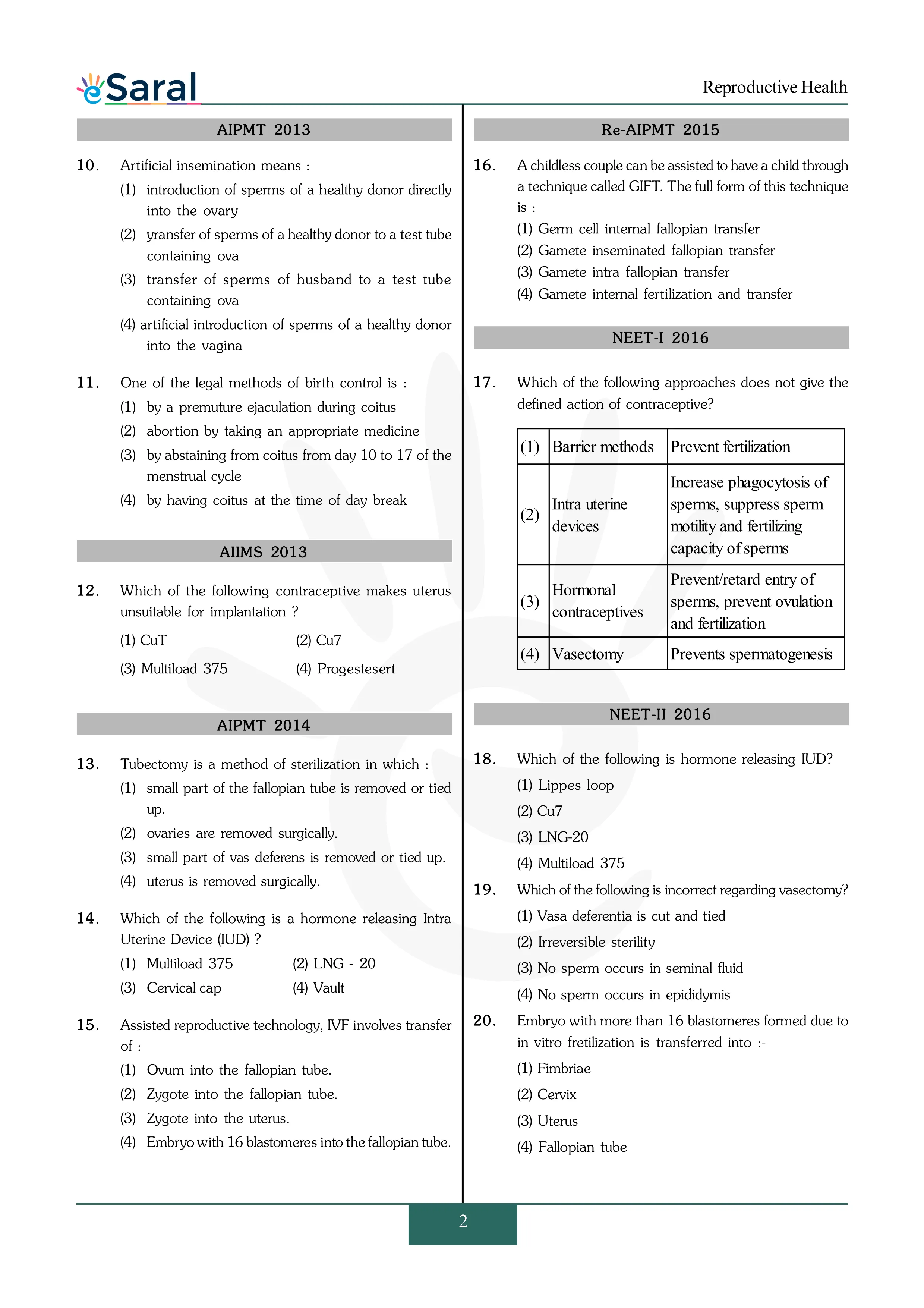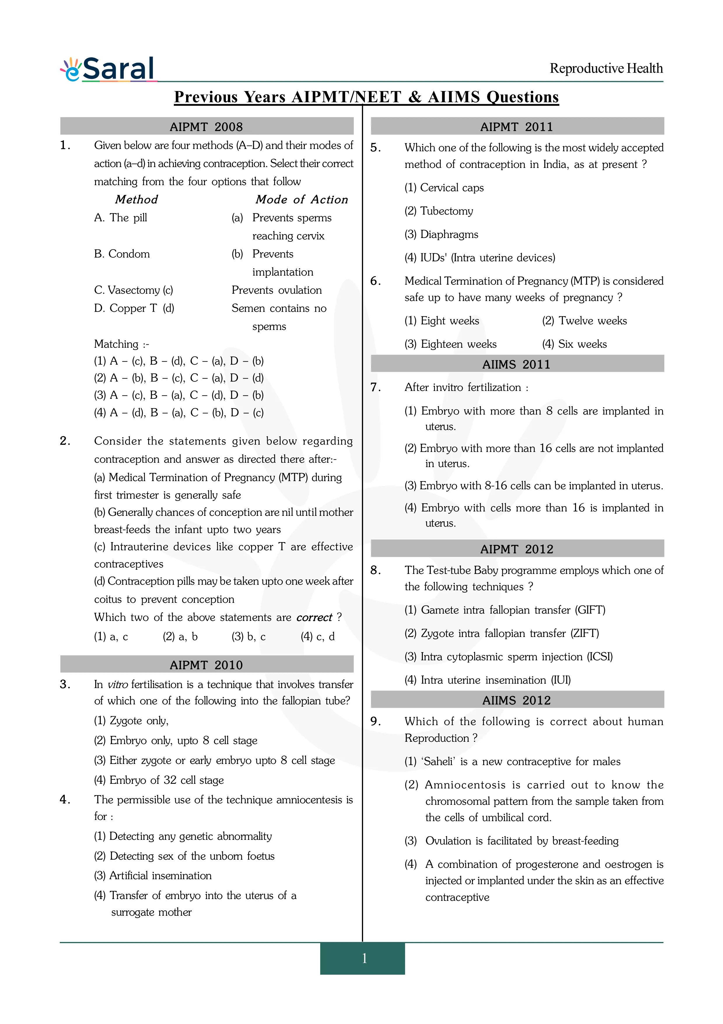 Here you will get Complete Reproductive Health NEET Previous Year Questions with complete and detailed solutions.