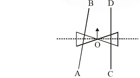 Q. A roller is made by joining together two cones at their vertices O. It is kept on two rails AB and CD which are placed asymmetrically (see figure), with its axis perpendicular to CD and its centre O at the centre of line joining AB and CD (see figure). It is given a light push so that it starts rolling with its centre O moving parallel to CD in the direction shown. As it moves, the roller will tend to :-