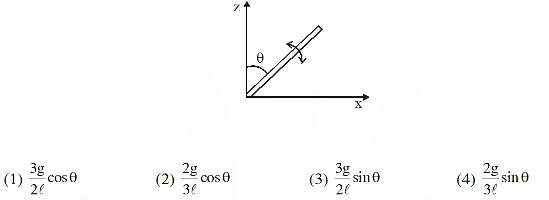 Q. A slender uniform rod of mass M and length is pivoted at one end so that it can rotate in a vertical plane (see figure). There is negligible friction at the pivot. The free end is held vertically above the pivot and then released. The angular acceleration of the rod when it makes an angle $\theta$ with the vertical is :