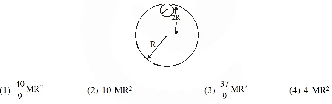 Q. From a uniform circular disc of radius R and mass 9M, a small disc of radius $\frac{\mathrm{R}}{3}$ is removed as shown in the figure. The moment of inertia of the remaining disc about an axis perpendicular to the plane of the disc and passing through centre of disc is :