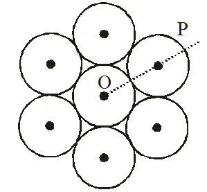 Q. Seven identical circular planar disks, each of mass M and radius R are welded symmetrically as shown. The moment of inertia of the arrangement about the axis normal to the plane and passing through the point P is :