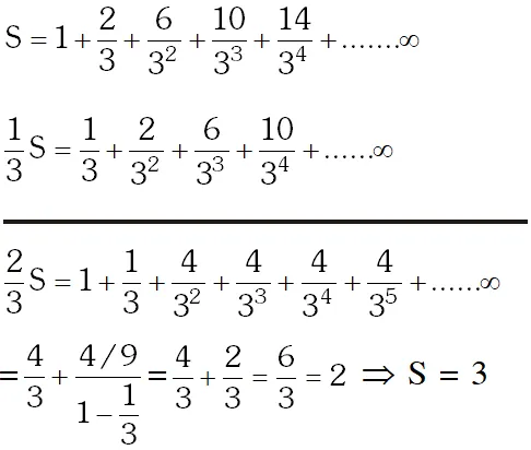 JEE Main Previous Year Question of Math with Solutions are available at eSaral. Practicing JEE Main Previous Year Papers Questions of mathematics will help the JEE aspirants in realizing the question pattern as well as help in analyzing weak & strong areas. eSaral helps the students in clearing and understanding each topic in a better way. eSaral is providing complete chapter-wise notes of Class 11th and 12th both for all subjects. Besides this, eSaral also offers NCERT Solutions, Previous year questions for JEE Main and Advance, Practice questions, Test Series for JEE Main, JEE Advanced and NEET, Important questions of Physics, Chemistry, Math, and Biology and many more. Download eSaral app for free study material and video tutorials. Q. The sum to infinity of the series $1+\frac{2}{3}+\frac{6}{3^{2}}+\frac{10}{3^{3}}+\frac{14}{3^{4}}+\ldots .$ is :- (1) 4 (2) 6 (3) 2 (4) 3 [AIEEE-2009]