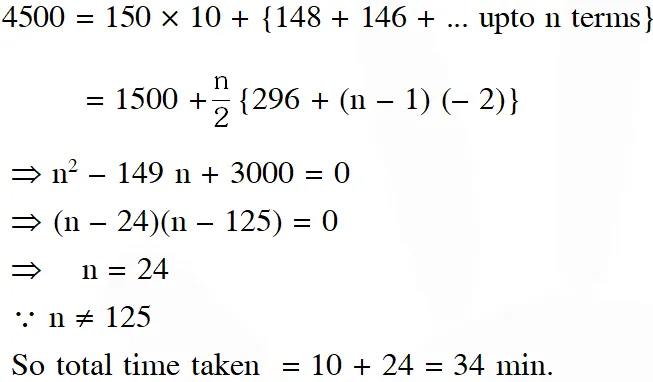 Q. A person is to count 4500 currency notes. Let a denote the number of notes he counts in the $\mathrm{n}^{\mathrm{th}}$ minute. If $\mathrm{a}_{1}=\mathrm{a}_{2}=\ldots=\mathrm{a}_{10}=150$ and $\mathrm{a}_{10} \mathrm{a}_{11}, \ldots$ are in an AP with common difference - $2,$ then the time taken by him to count all notes is :- (1) 24 minutes (2) 34 minutes (3) 125 minutes (4) 135 minutes [AIEEE-2010]