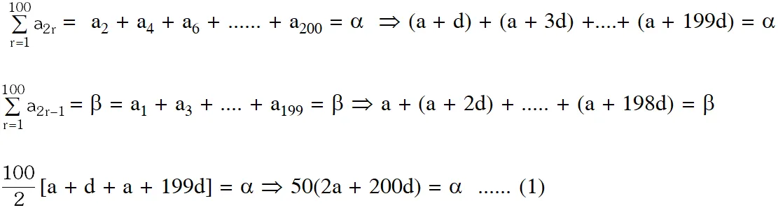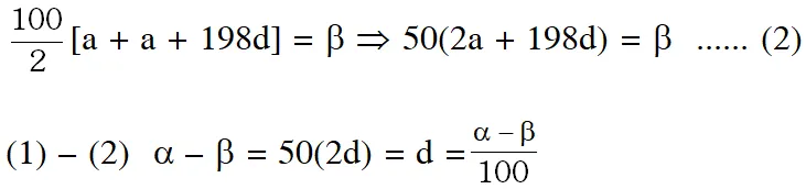 Q. Let $a_{n}$ be the $n^{\text {th }}$ term of an A.P. If $\sum_{r=1}^{100} a_{2 r}=\alpha$ and $\sum_{r=1}^{100} a_{2 r-1}=\beta,$ then the common difference of the A.P. is : (1) $\frac{\alpha-\beta}{200}$ (2) $\alpha-\beta$ (3) $\frac{\alpha-\beta}{100}$ (4) $\beta-\alpha$ [AIEEE-2011]
